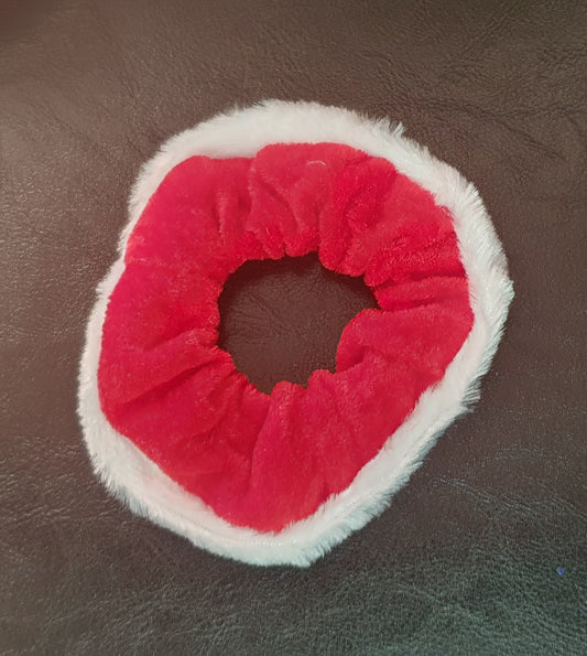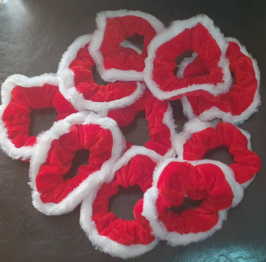 Christmas fluffy snowy trim velvet hair scrunchie bobbles red and green plain and red designs set of 4