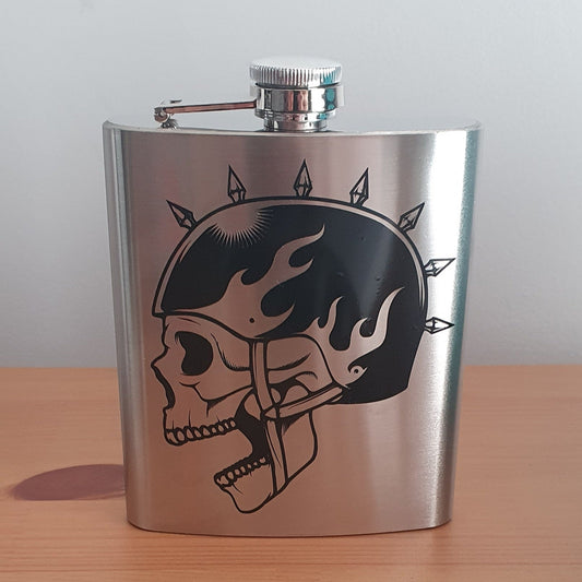 personalised 7oz stainless steel silver biker skull hip flask