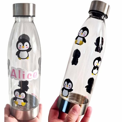 Personalised clear plastic water bottle penguin design