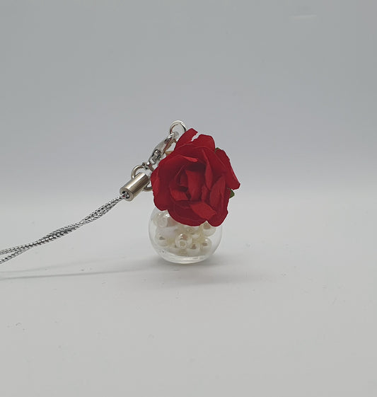 Glass potion bottle with faux pearl beads and rose keepsake charm