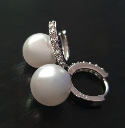 Silver loop earrings with cubic zirconia and freshwater pearl