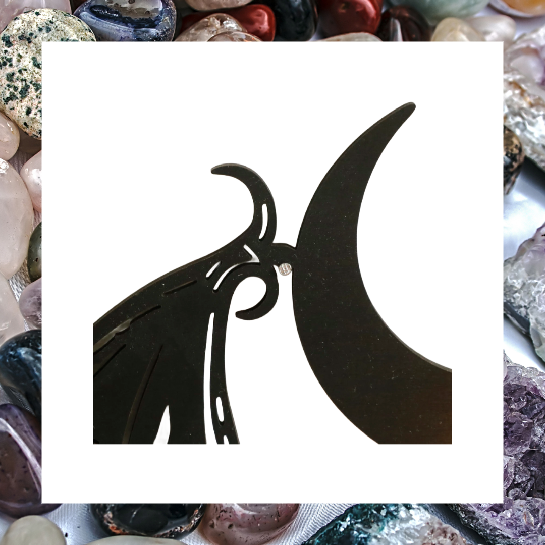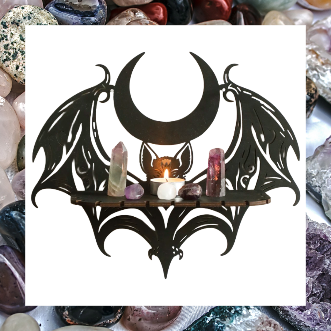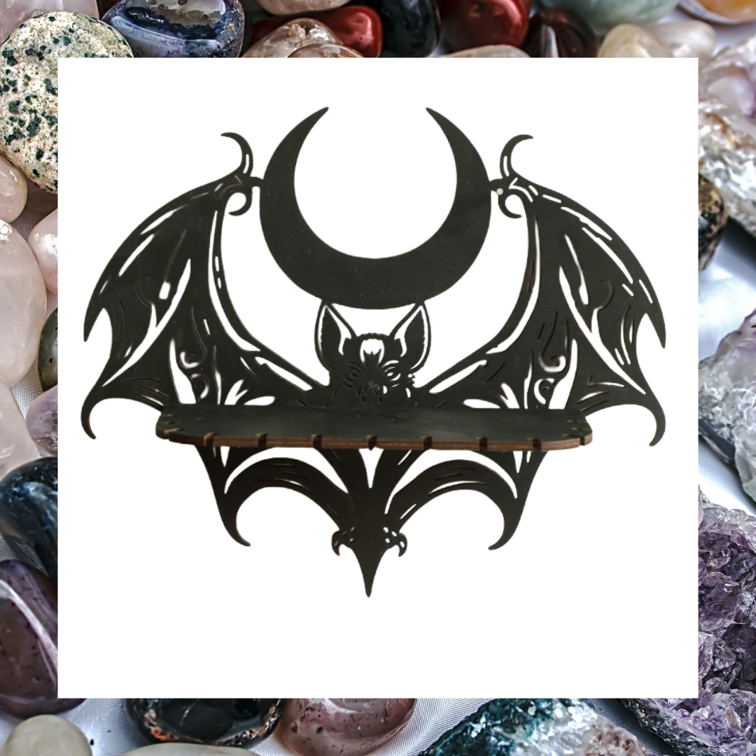 Elevate your space with this striking black wooden wall shelf featuring a winged bat and crescent moon design. Perfect for adding a touch of gothic charm, it combines unique artistry with practical storage for your crystals. Display your favourite treasures while making a bold statement that captivates and inspires.