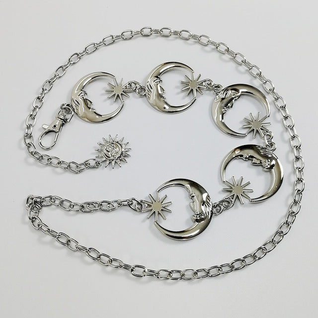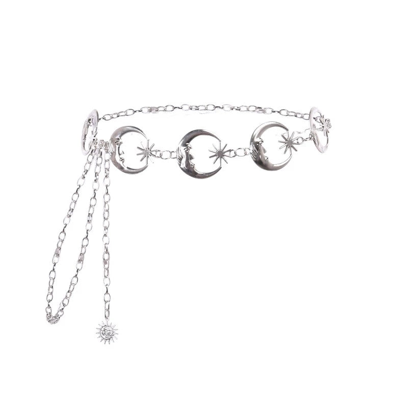 Features and chain with moons and stars around the front and a sun on the end of the chain