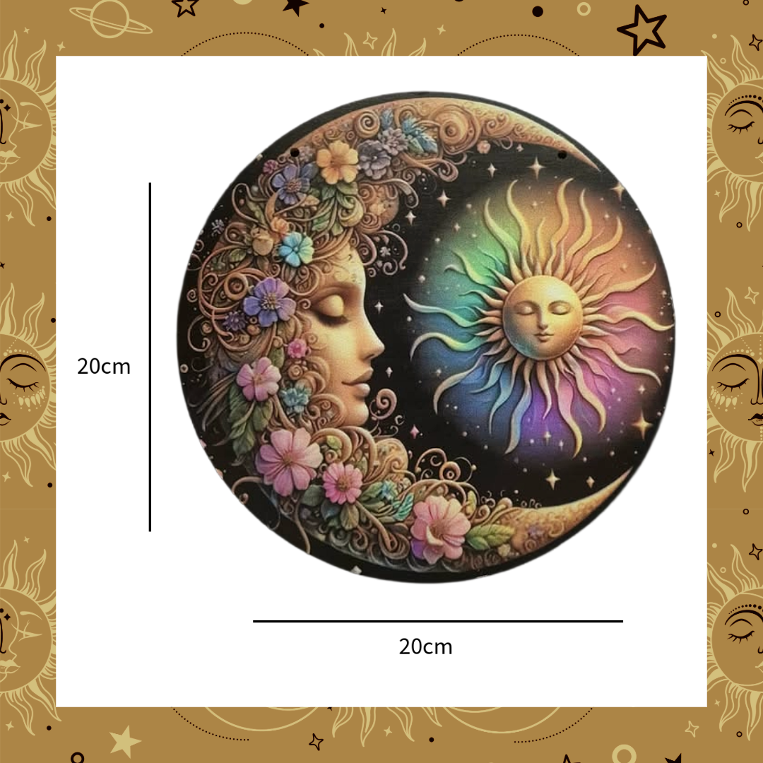Add a touch of celestial elegance to your space with this 8x8" round wooden plaque. Featuring a beautiful golden sun, moon, and stars intertwined with delicate floral accents, it brings warmth and charm to any room. Crafted for durability and style, this wall art creates a serene atmosphere that inspires and enchants. Perfect for adding a mystical, artistic flair to your home décor.