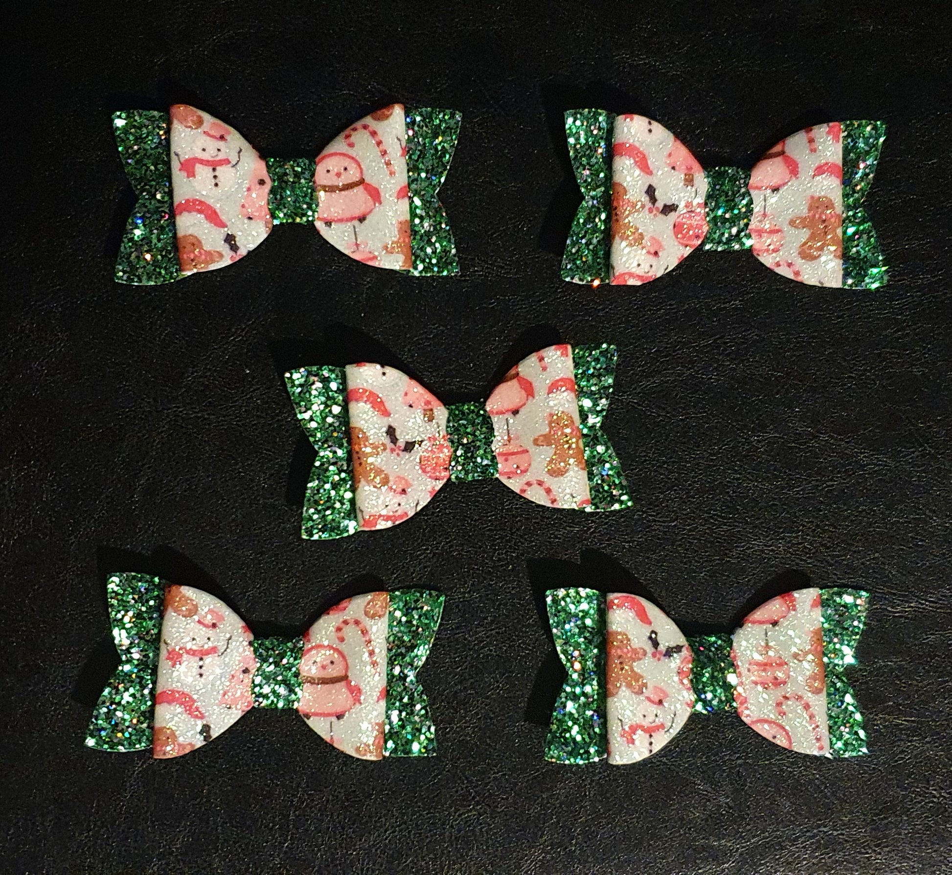 Christmas Sparkly Green/Patterned Christmas Hair Bows Penguin, Santa Hat, Bauble, Candy cane and Gingerbread