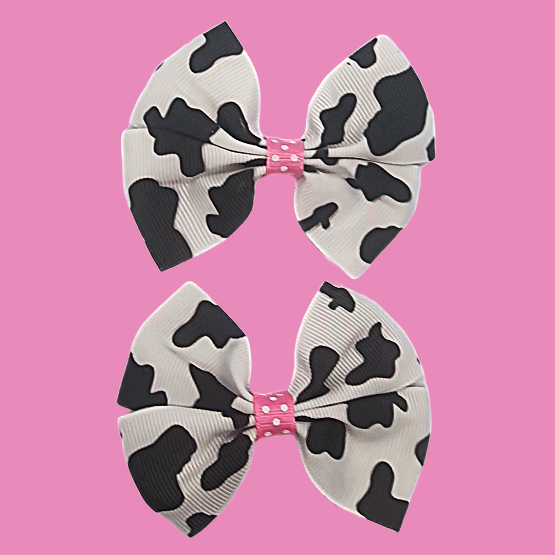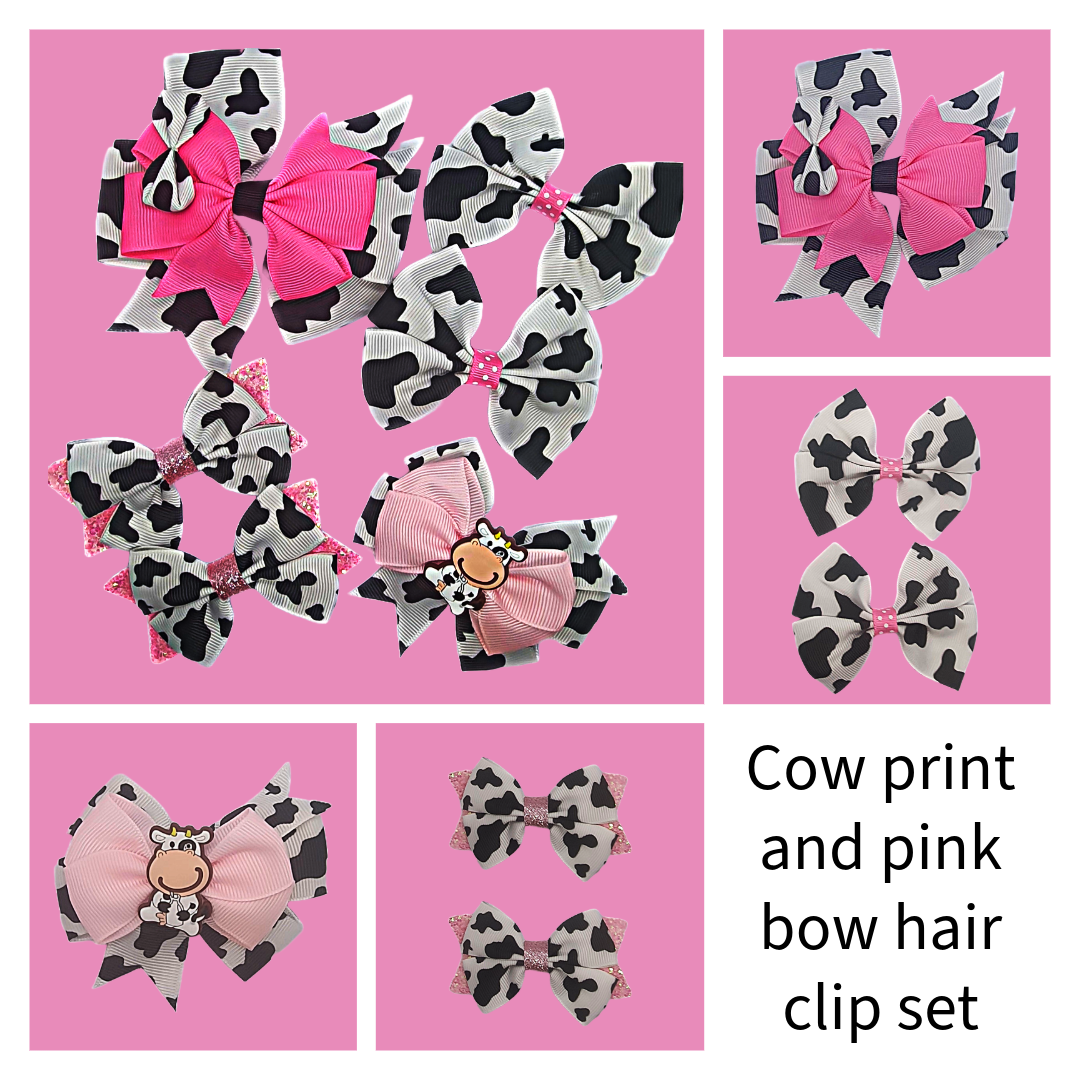 Complete any outfit with this adorable Cow Print and Pink Ribbon Bow Hair Clip Set! The set includes a large single bow, a medium single bow, and two medium pigtail sets, all featuring a combination of cow print and pink ribbon. With this set, you can effortlessly add a touch of fun and style to your hair.
