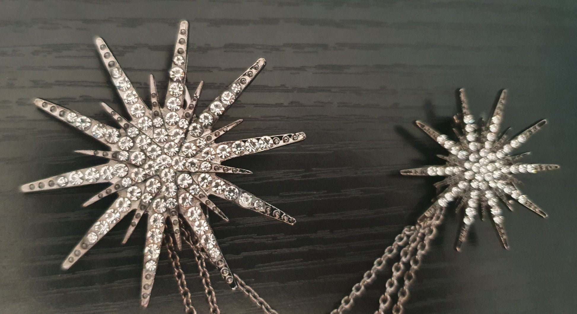 Both stars are covered in beautiful rhinestone crystals and have a closing pin on the back of each.