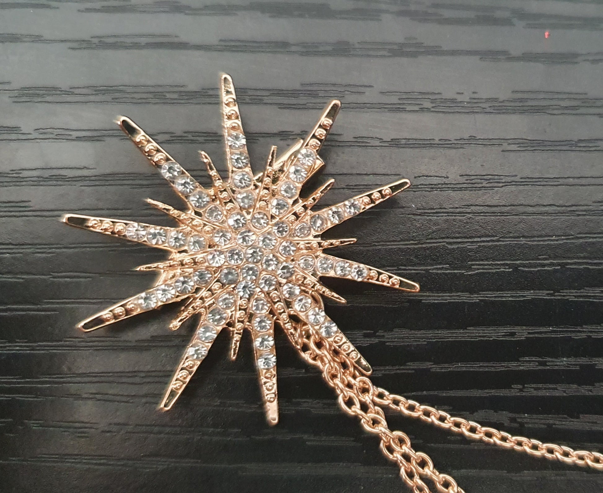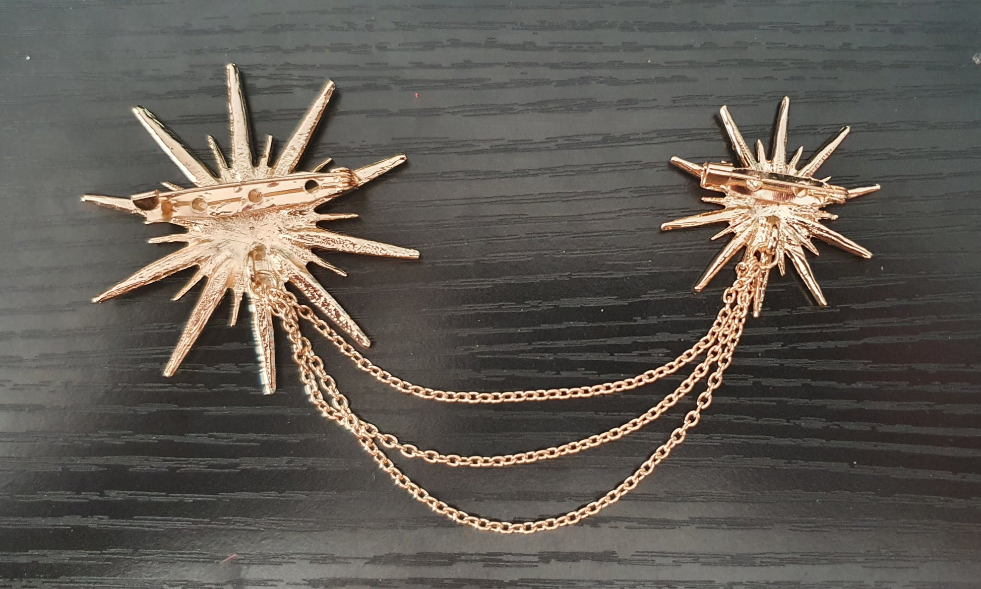 This brooch has been designed with one large star and one slightly smaller star connected with 3 chains.
