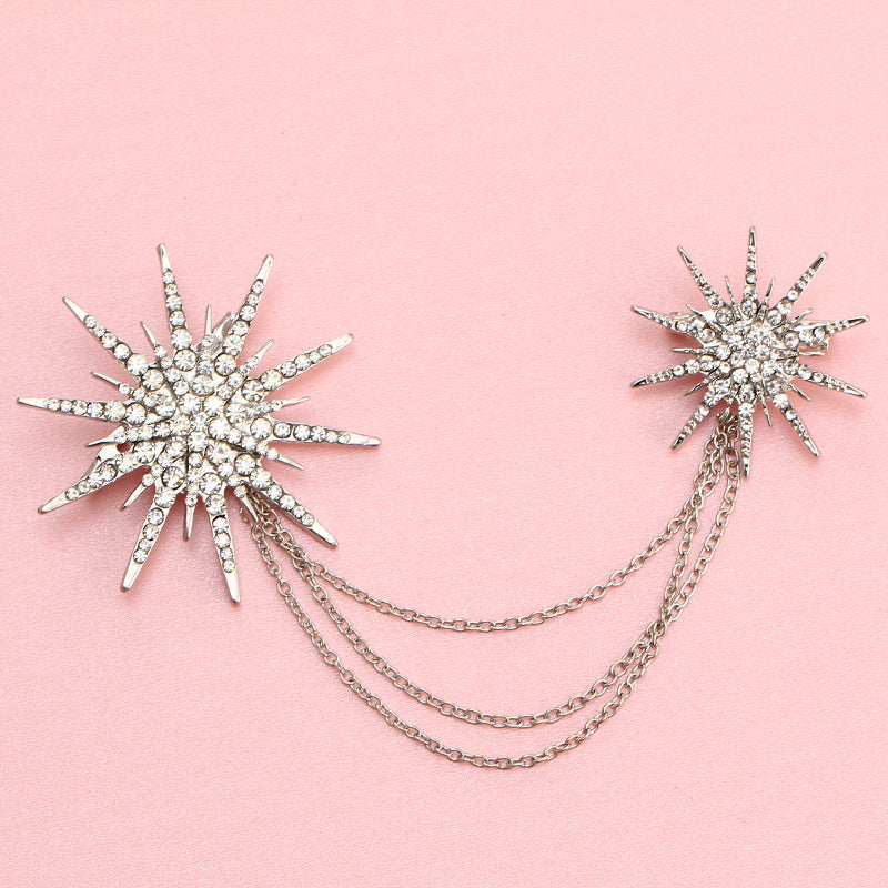 Double star brooch with connecting chain black gold silver pin brooch with crystal rhinestones