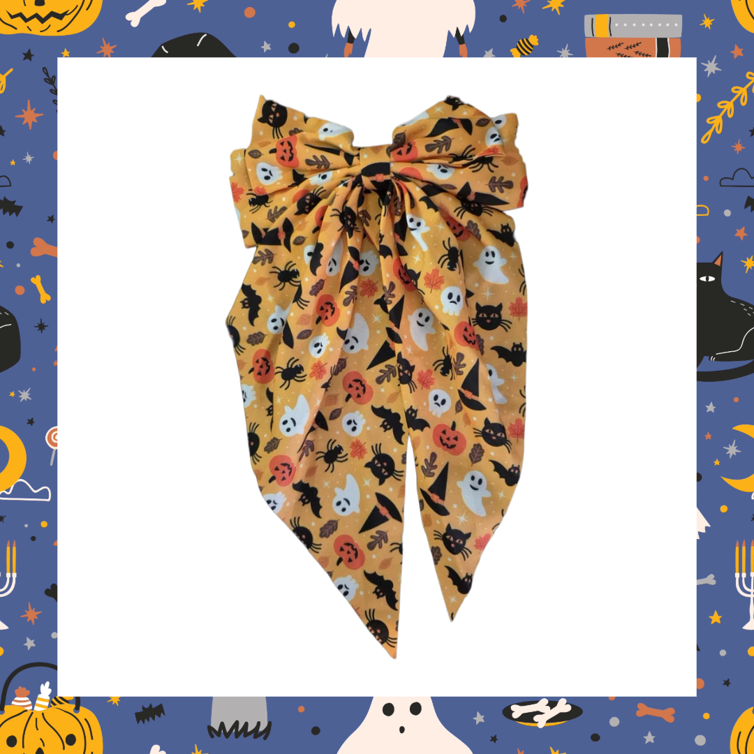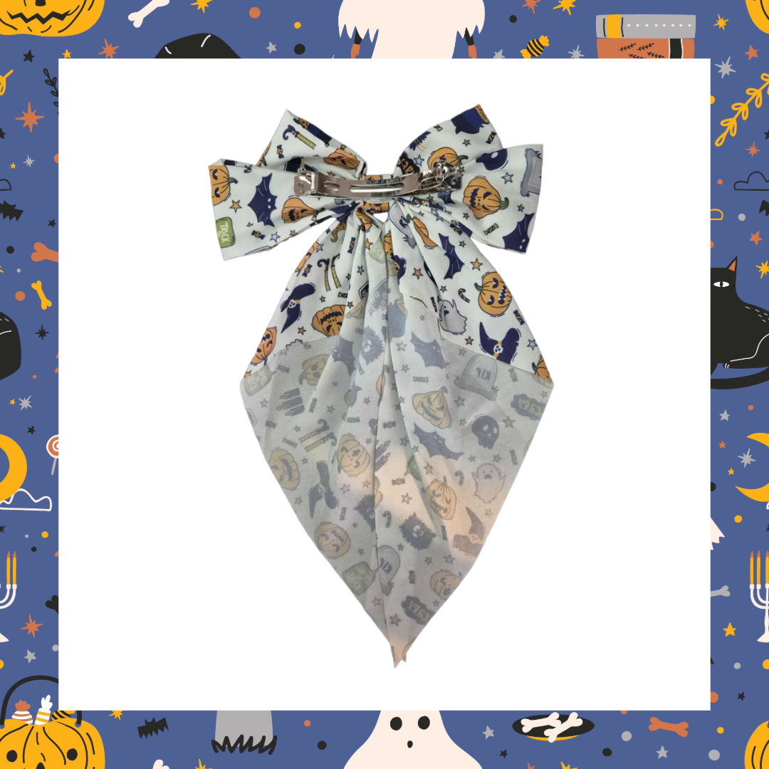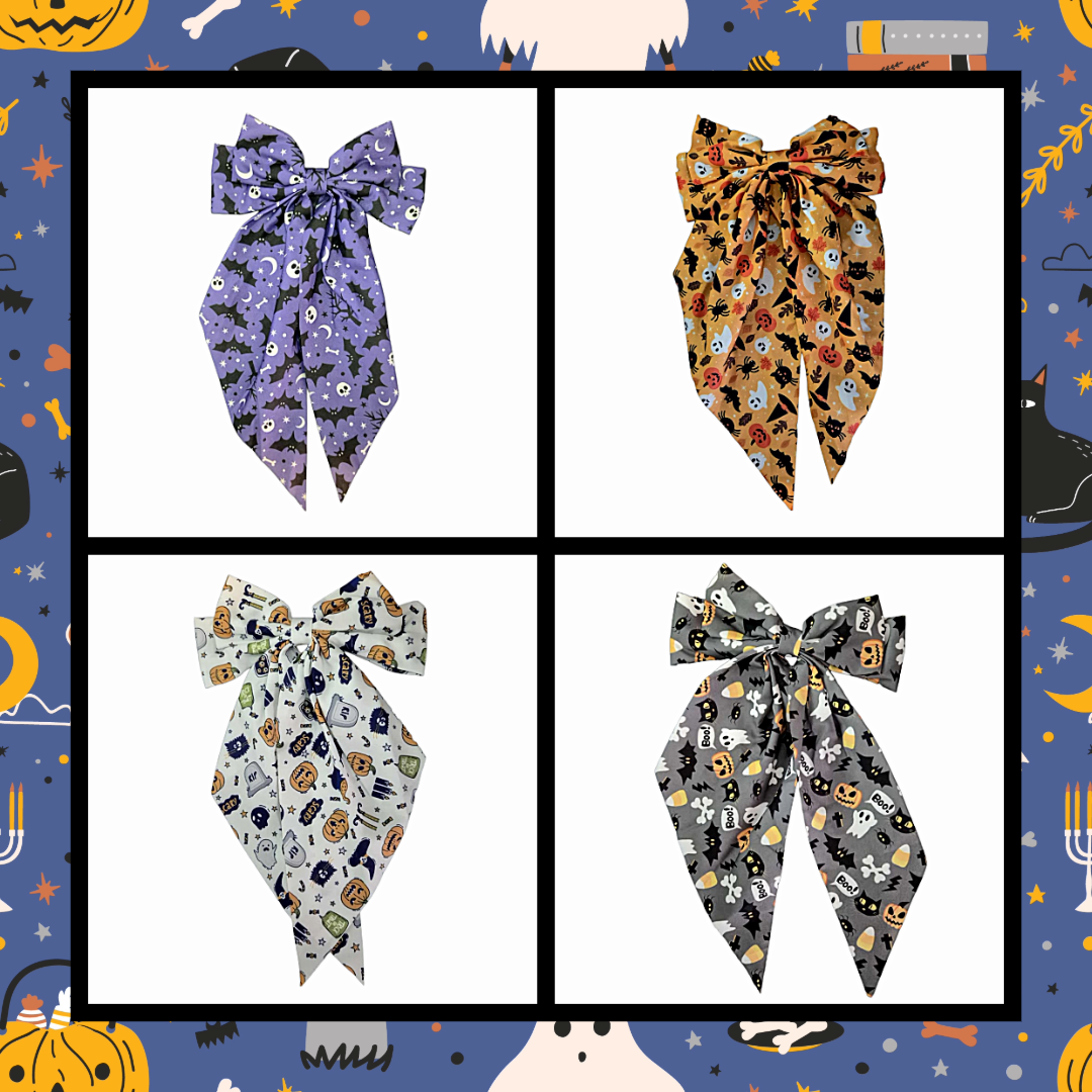 Celebrate Halloween in style with these large silky hair bows featuring iconic spooky prints like bats, witches, ghosts, pumpkins, spider webs, bones, skulls, and skeletons. Perfect for adding a festive touch to any outfit, these barrette clips combine eye-catching designs with gentle hold, making them ideal for parties, trick-or-treating, or everyday Halloween fun. Elevate your holiday look effortlessly while showcasing your seasonal spirit with these unique and vibrant accessories.
