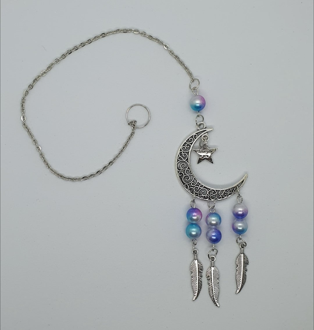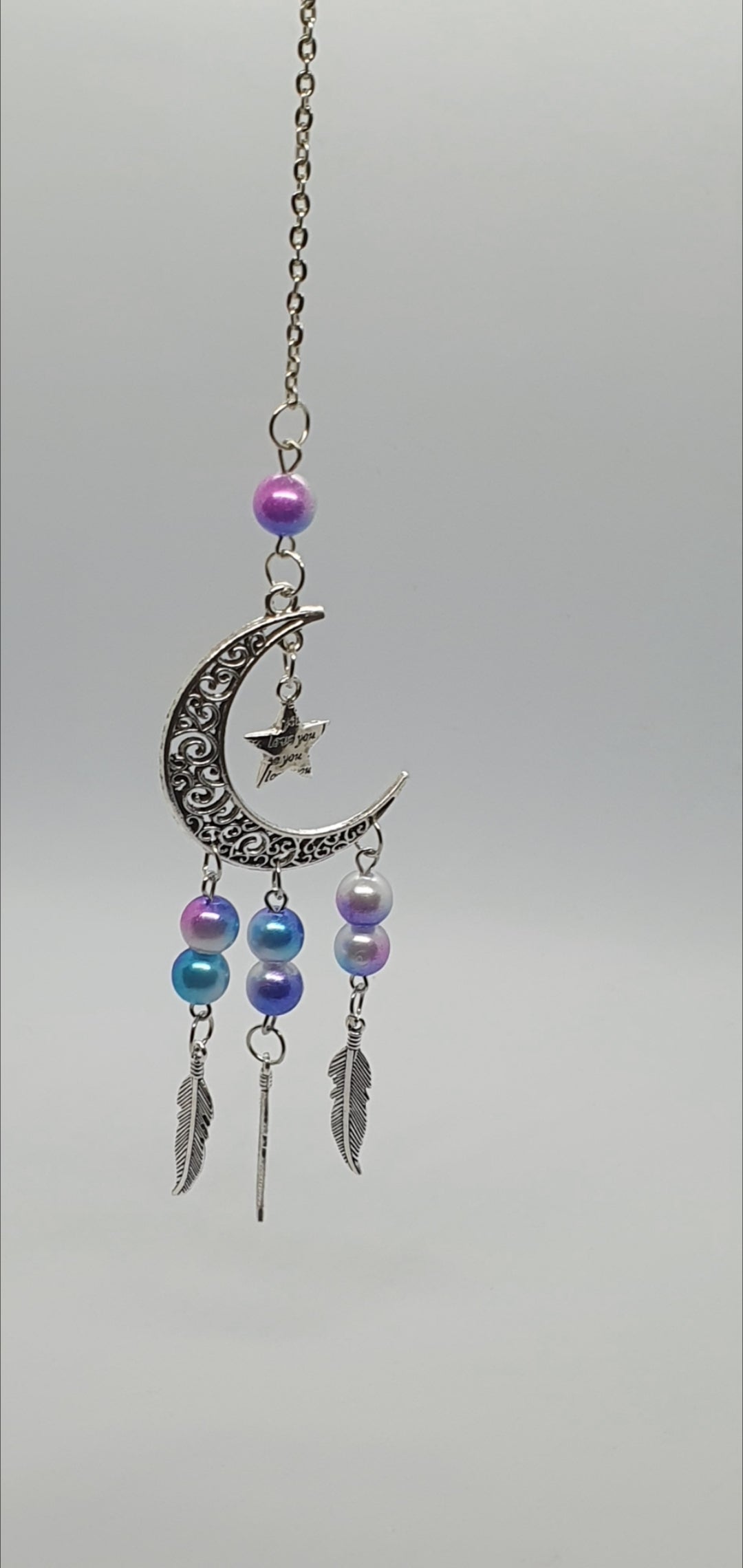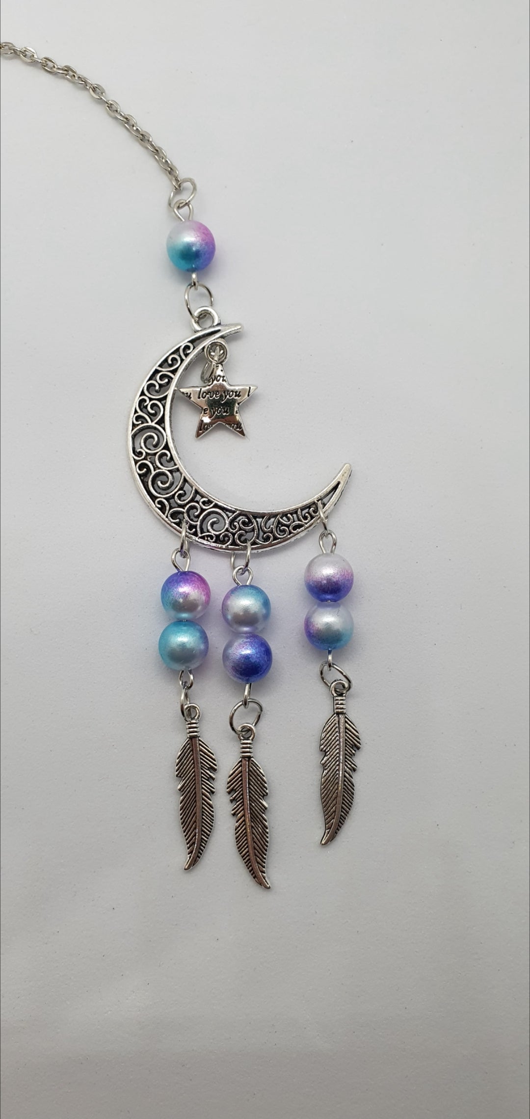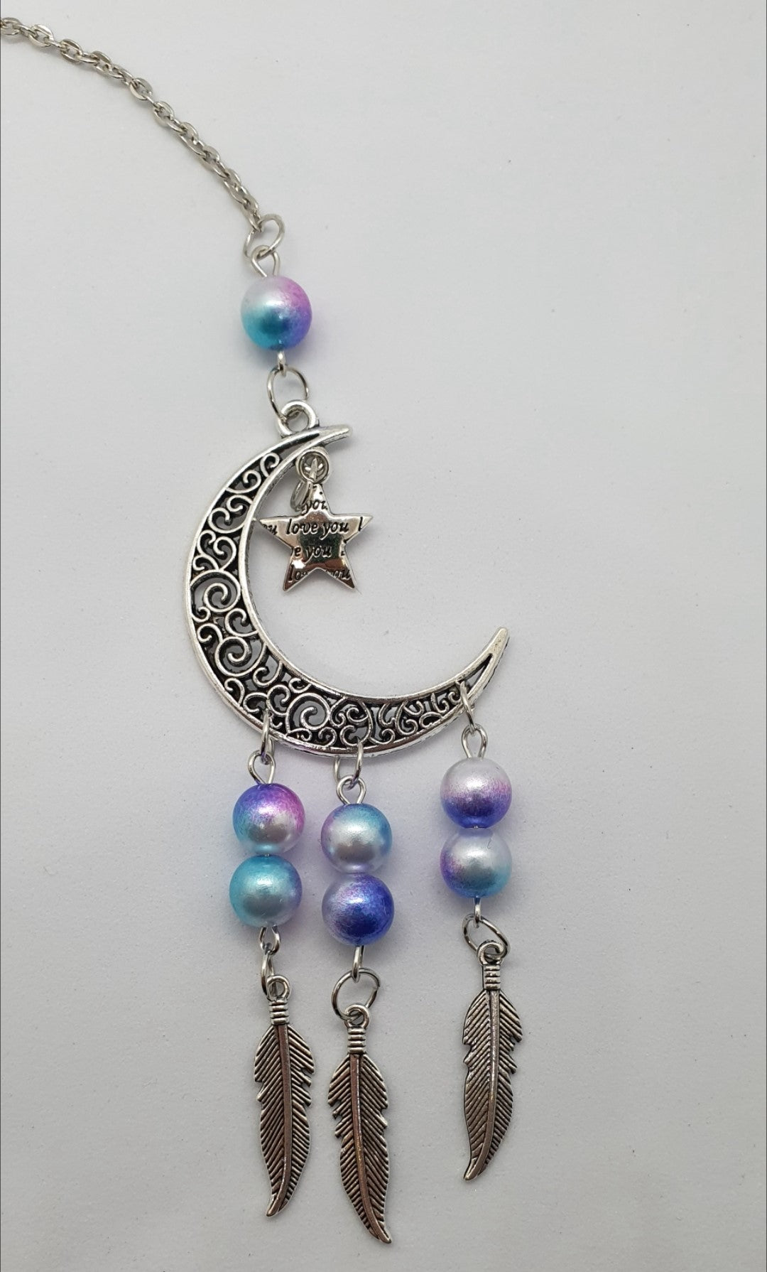 Add a touch of celestial love to any space with our Moon and Star "Love You" hanging ornament. Featuring delicate beads and feather details, this charming piece is perfect for reminding someone special just how much they mean to you. Bring joy and love to any room with this beautiful, handcrafted ornament.