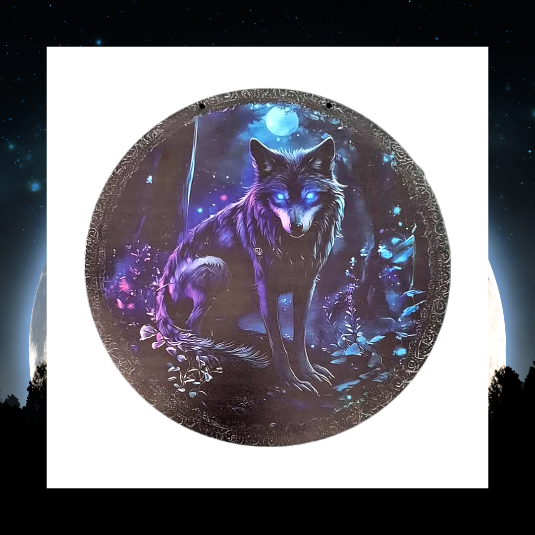Mysterious wolf sat in a moonlit forest 2D flat round wooden sign for home and office decoration