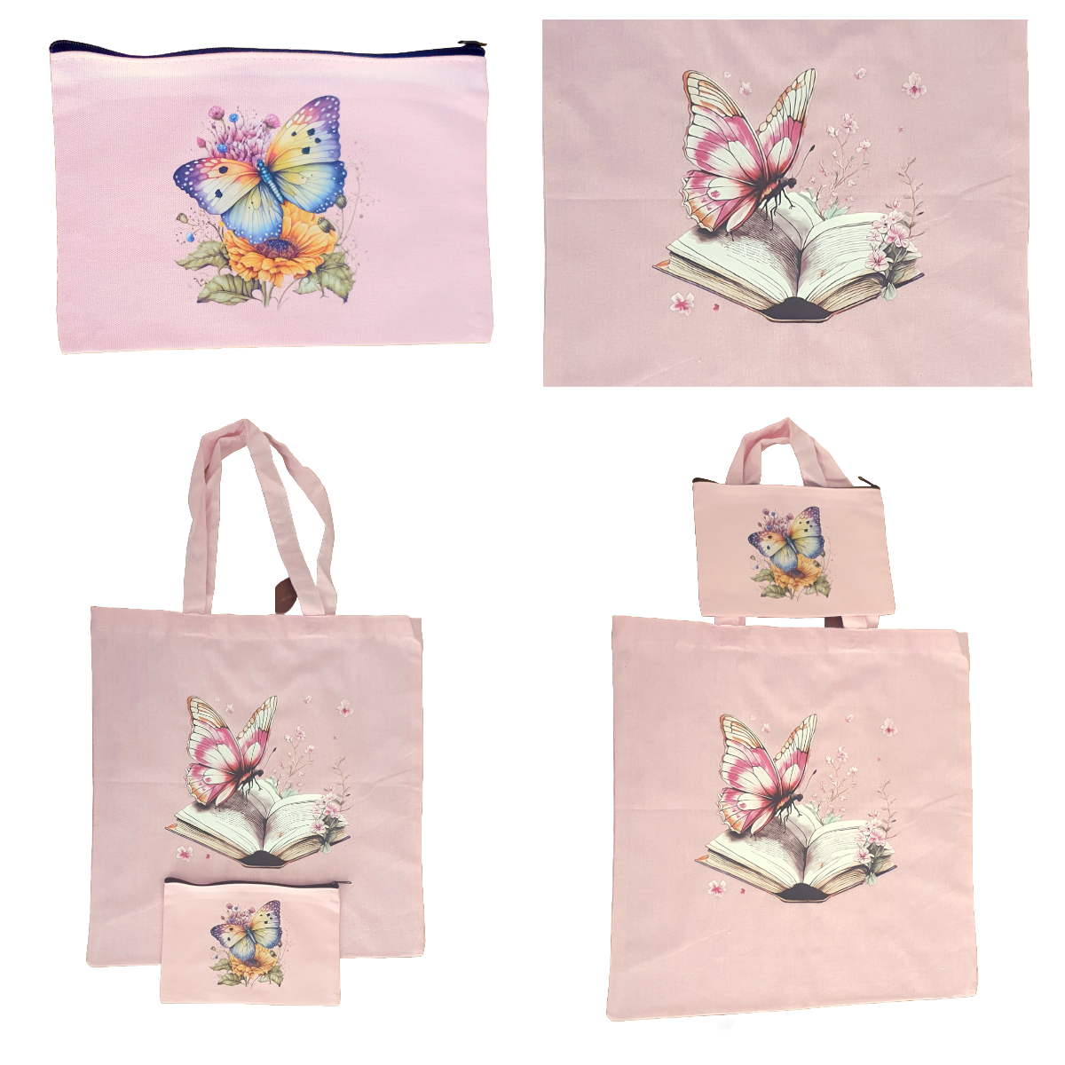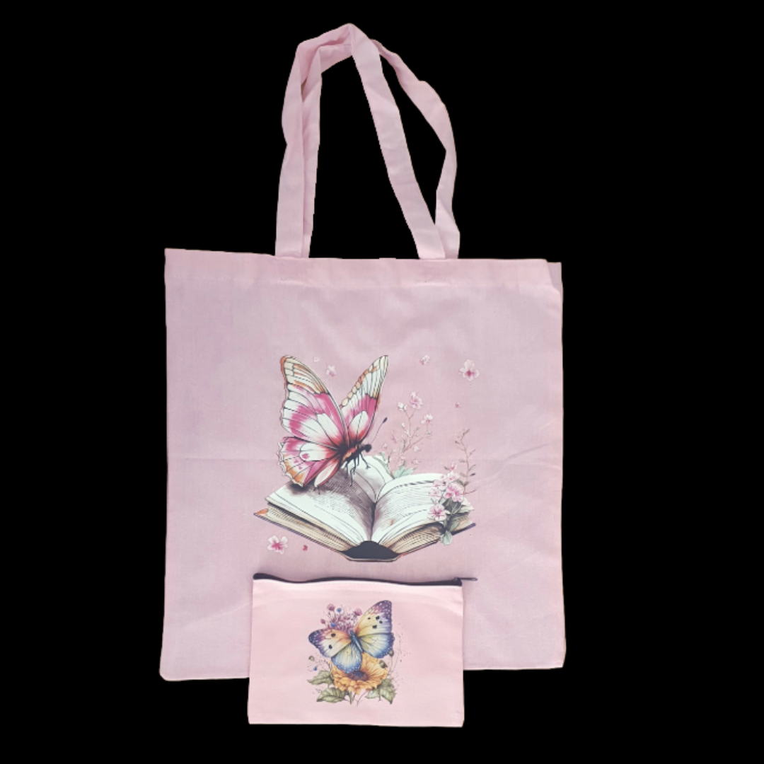 You will receive one tote bag with a butterfly on a book design and one pink zip case with a butterfly floral design on it.