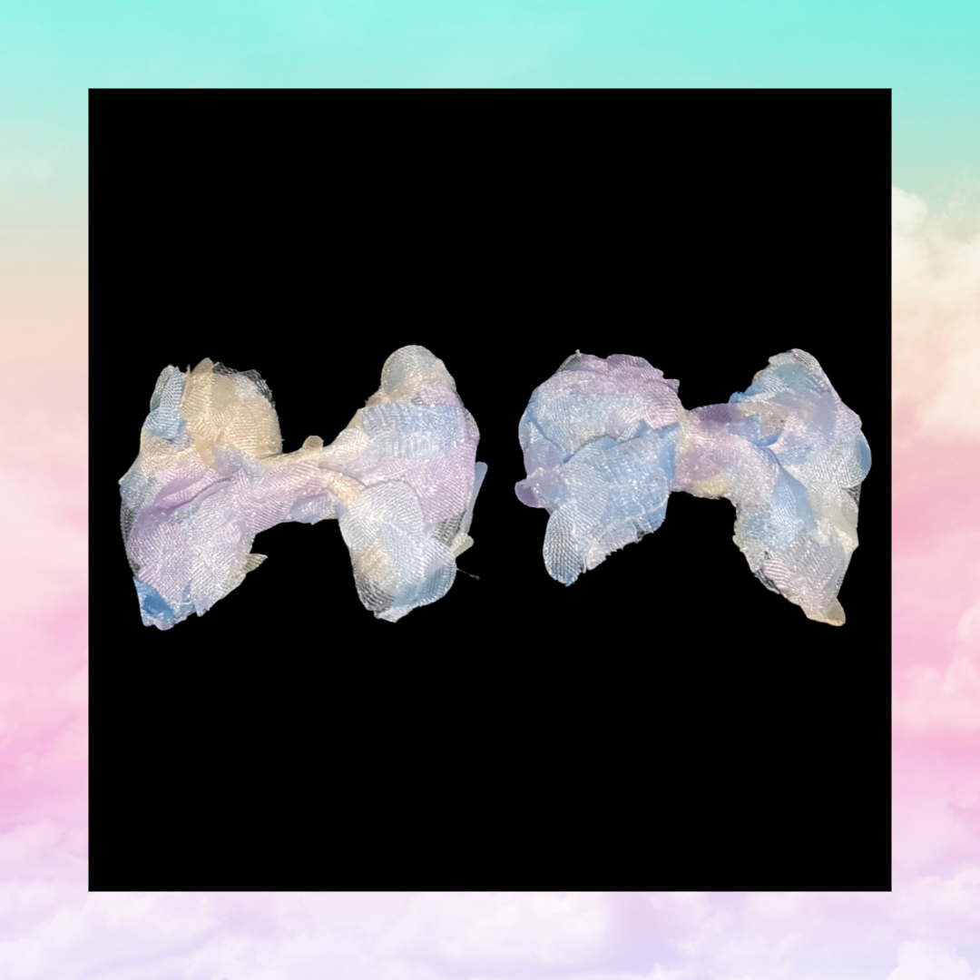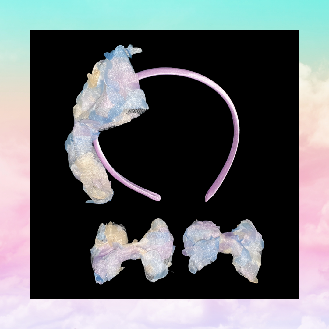 Pretty lilac satin headband With a beautiful large soft ribbon lilac/blue/yellow bow attached with matching pigtail bow clips