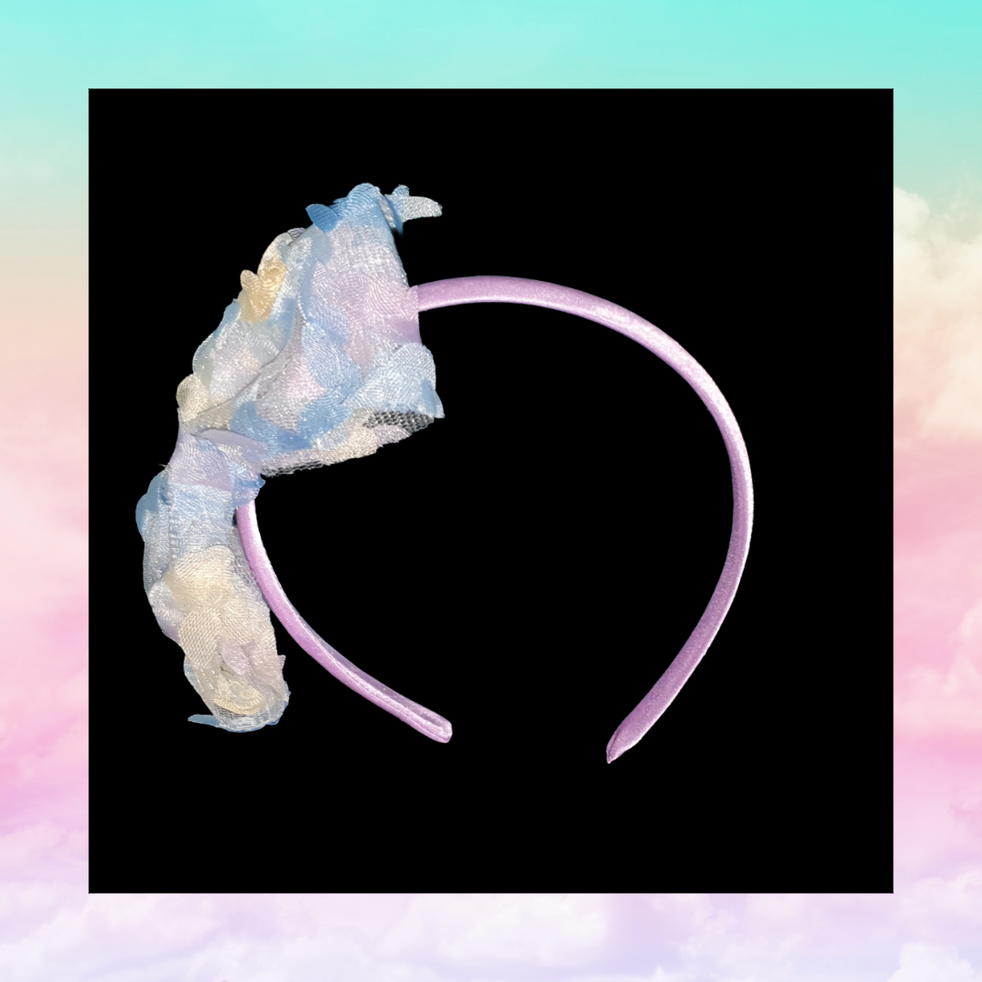 Large Lilac/blue/yellow soft ribbon bow on a lilac satin headband