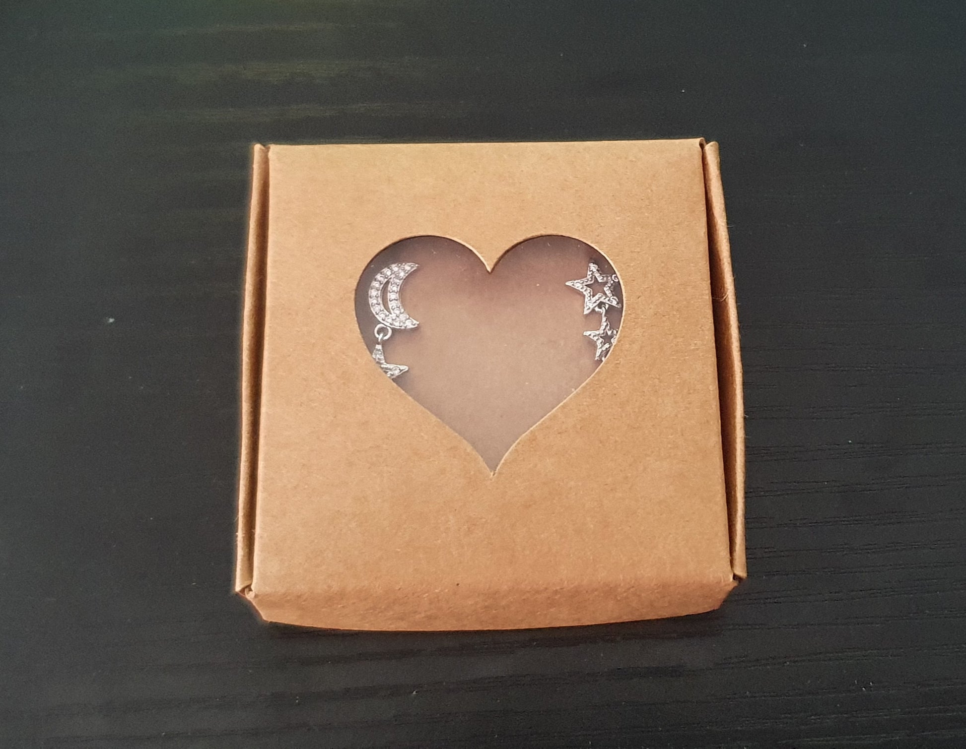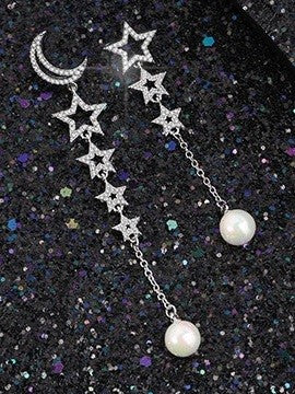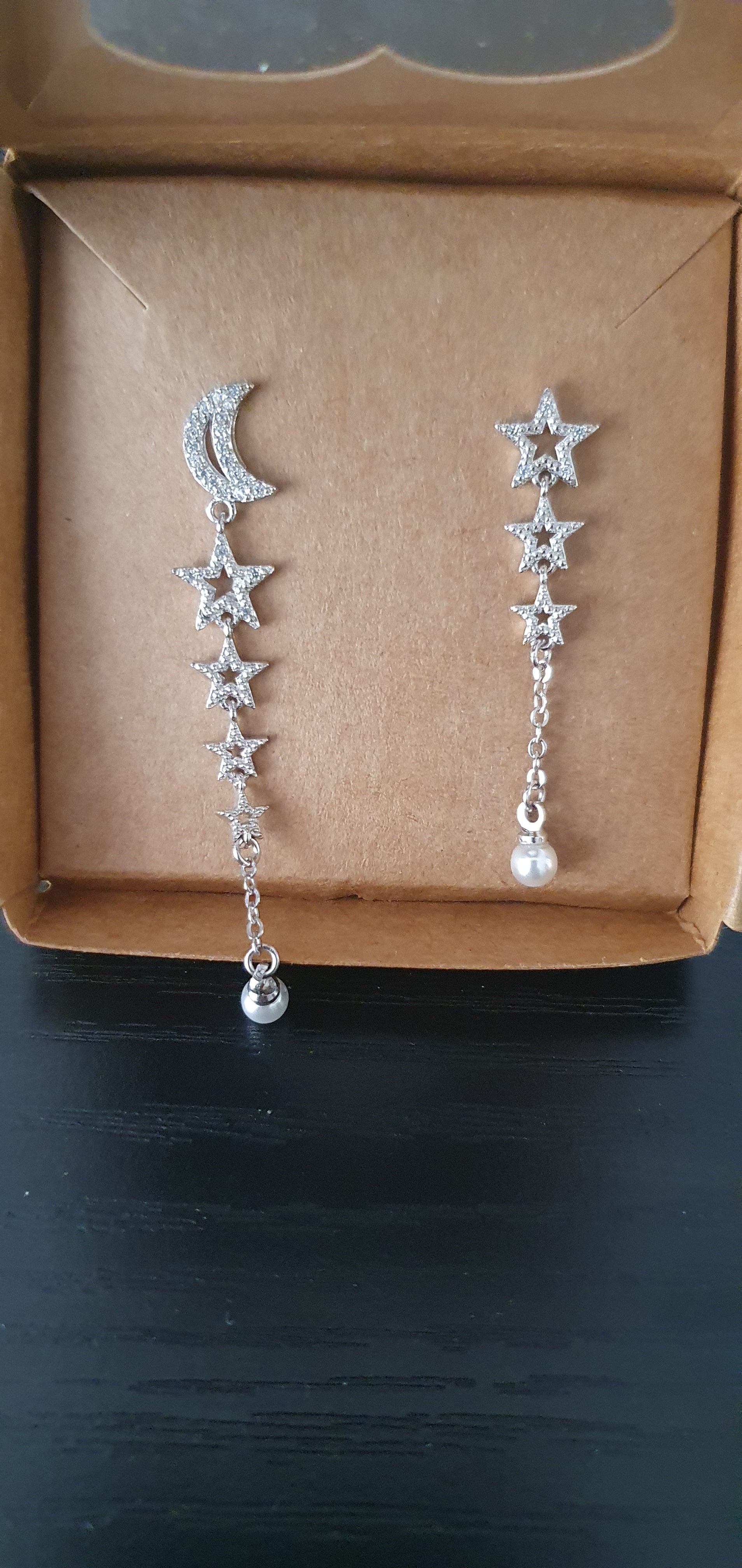 one earring has a moon at the top followed by four stars a bit of chain leading to a pearl the other has three stars with a bit of chain leading to a pearl.