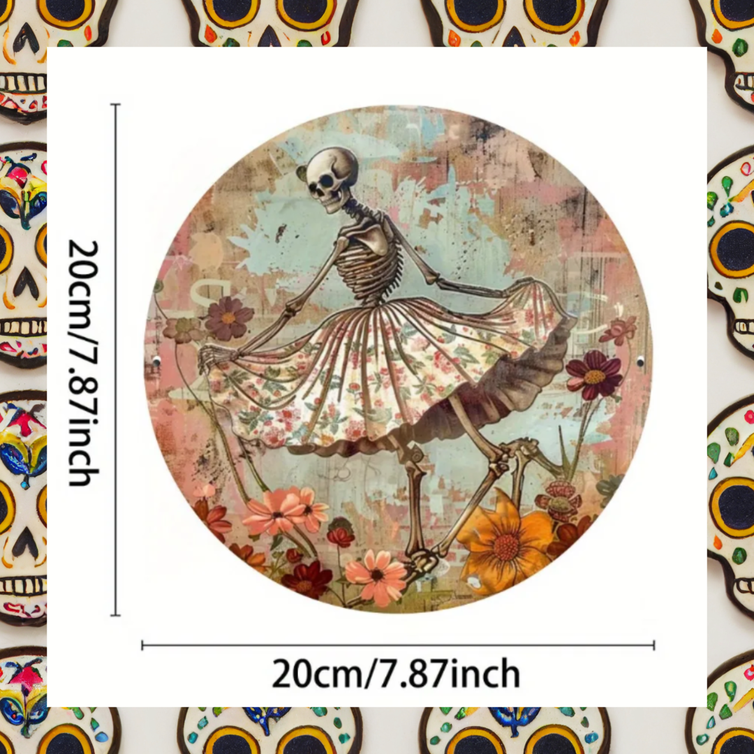 Add a unique touch to your space with this striking metal wall art plaque featuring a skeleton dressed in a floral skirt amidst a flower field. Crafted for durability and style, it blends edgy design with natural beauty, making it a captivating centrepiece for any room. Perfect for those who appreciate bold, artistic décor that sparks conversation and adds personality to your home.