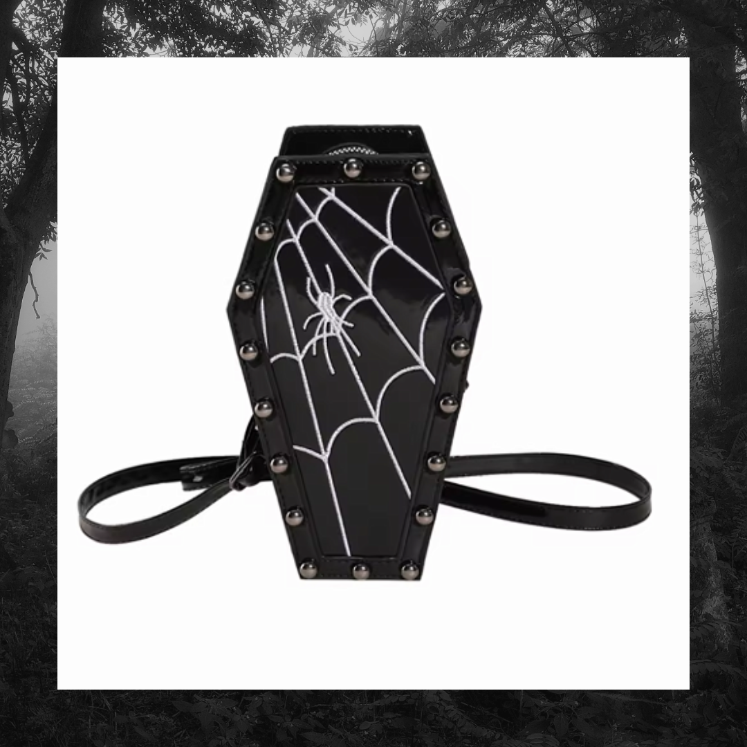 Embrace your dark side with the Spider Coffin Studded Gothic Crossbody Satchel Bag. Designed with striking stud detailing and a unique coffin shape, this bag adds an edgy statement to any outfit. Its compact size and adjustable strap make it ideal for hands-free convenience while securely holding your essentials. Perfect for gothic fashion lovers seeking both style and practicality.