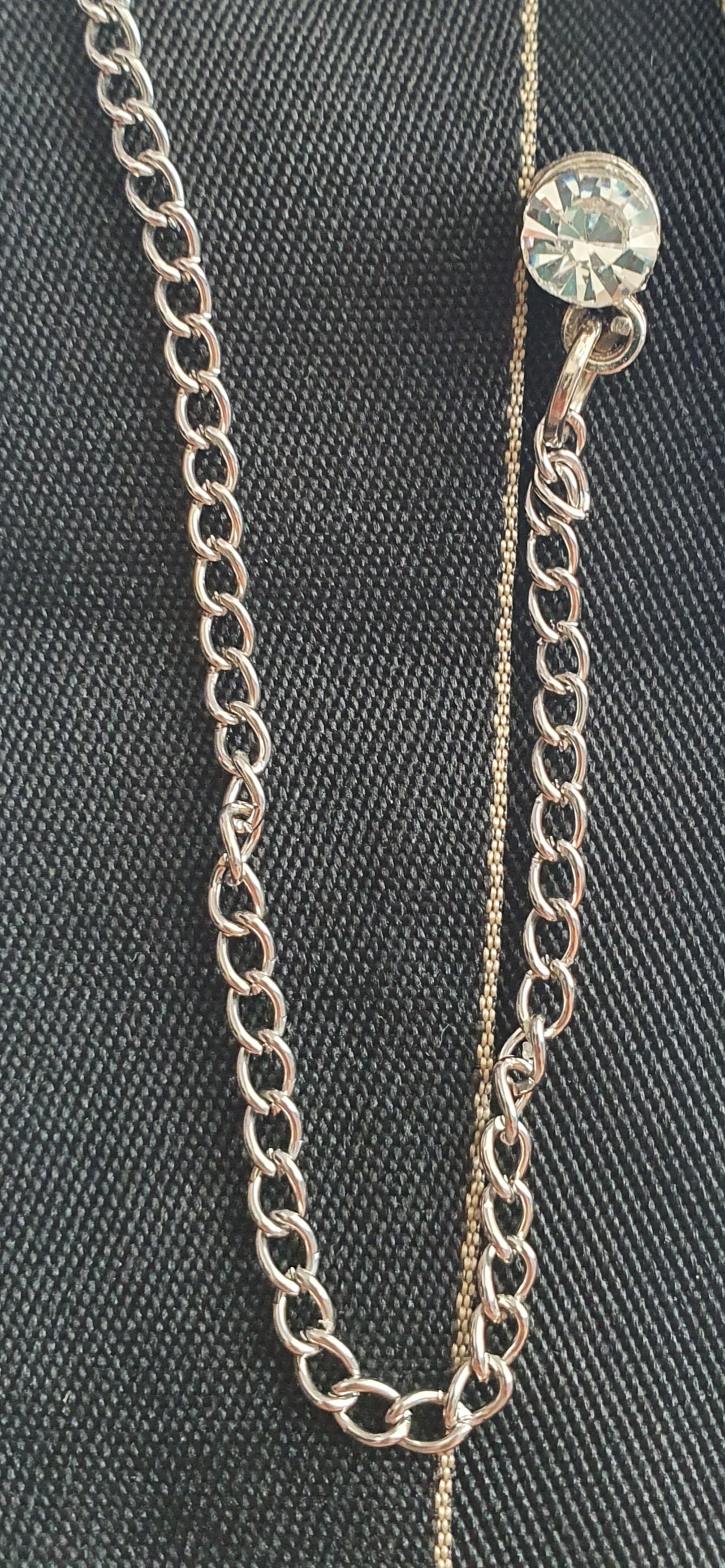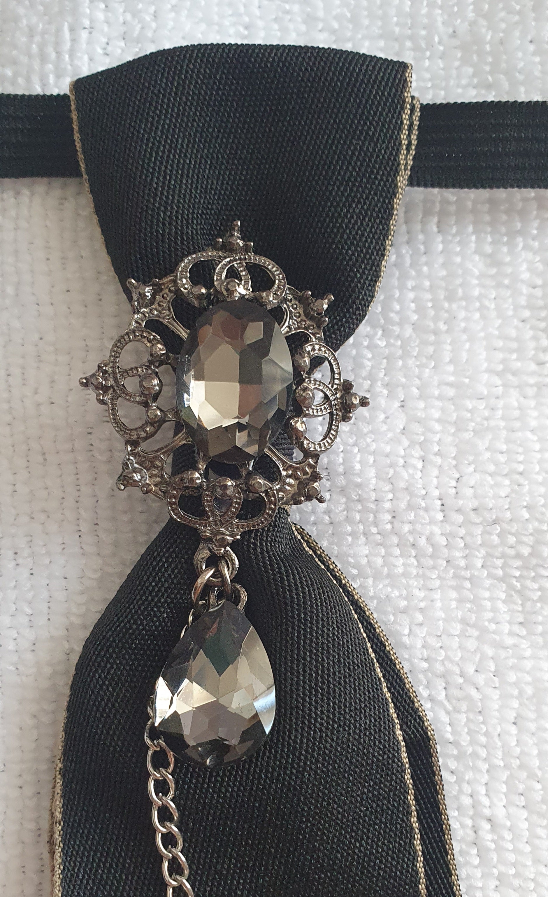 Black pretied necktie featuring a black crystal rhinestone pendant and chain.