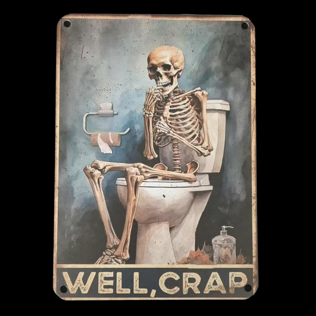 Add a quirky touch to your bathroom with this Toilet Humour Skeleton aluminium metal sign. Made from durable metal, it’s designed to withstand damp environments while bringing a fun, cheeky vibe to any toilet or bathroom wall. Its humorous skeleton motif is sure to spark laughter and lighten the mood, making every visit memorable. Easy to hang and built to last, this playful plaque is the perfect way to showcase your unique sense of humour and keep guests entertained.