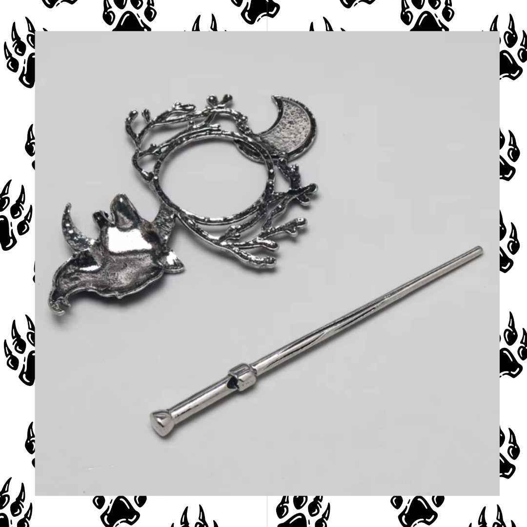 Add a touch of mystique to your hairstyle with this Vintage Crescent Moon Wolf hair pin slide clip. Featuring a detailed wolf silhouette against a crescent moon, it blends nature-inspired elegance with vintage charm. Perfect for securing your hair while showcasing your unique style, this clip offers both functionality and timeless appeal. Elevate any look effortlessly with this striking accessory.