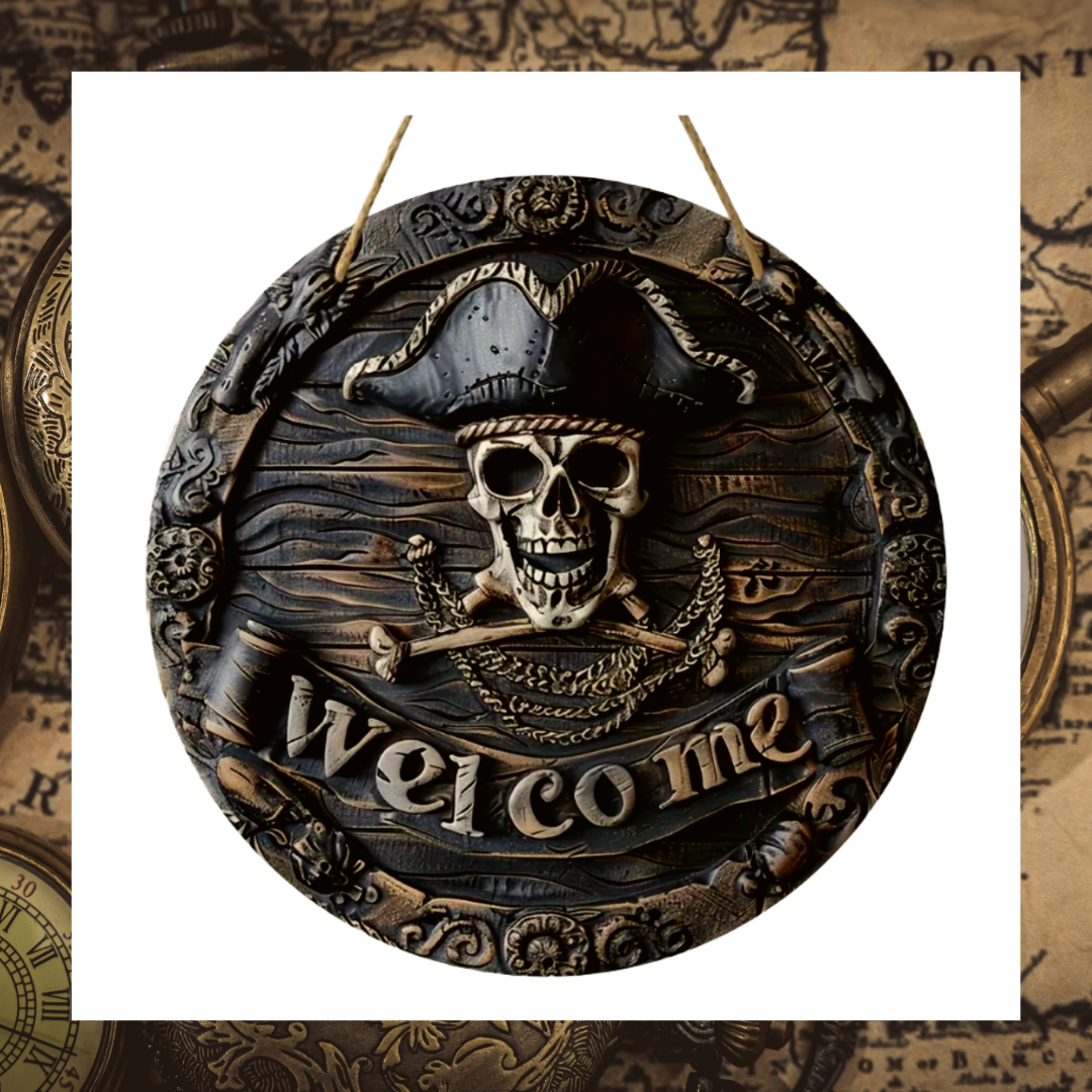 Add a bold, adventurous touch to your space with this 8x8" wooden wall plaque featuring a striking pirate skull and crossbones design. Perfect for creating a welcoming yet daring atmosphere, its sturdy construction ensures lasting charm. Ideal for pirate fans or those seeking a unique statement piece that captures a spirit of adventure.